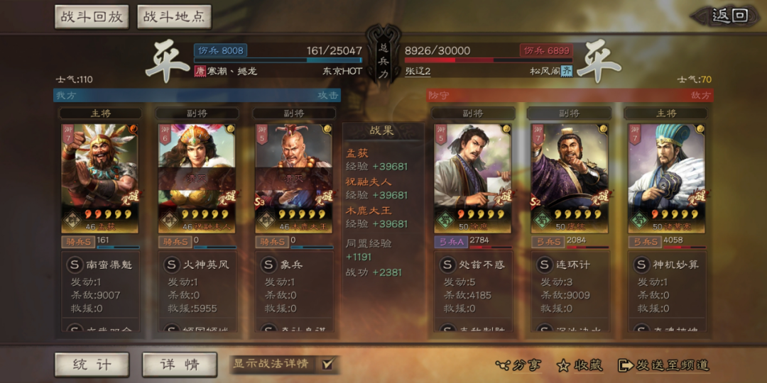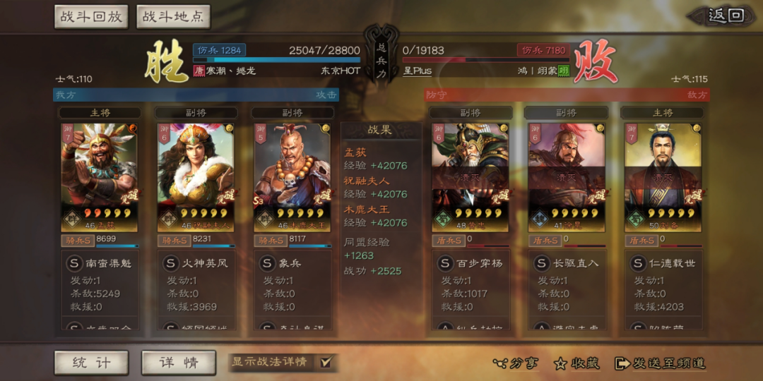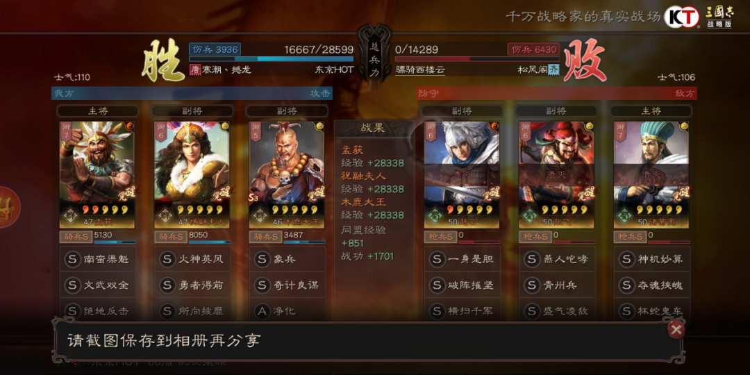 阵容安利丨南蛮入侵2020-05-22 21:01:36 主将 孟获:文武双全+绝地反击 副将 祝融:勇者得前+所向披靡 副将 木鹿大王:奇计良谋+净化 (感谢玩家@东京HOT投稿) 木鹿大王的象兵加上蛮将减伤,所以队伍防御力是够了,主要增加伤害,但是整个队伍智力偏低,所以在战法选择上尽量少带主动战法避免被诸葛神算,在面对谋略队伍的时候比较吃力,同时带上净化尽可能的防止被灼烧,最好还是带上横戈跃马减少谋略伤害。
