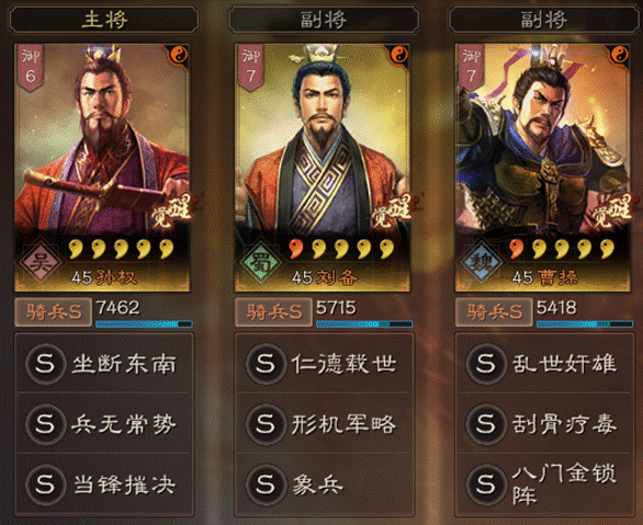 增益状态叠加的速度受战场环境影响很大,不仅要靠自己,还得靠队友。因此不管别人怎么认为,又或者如何去证明,在我的眼里孙权至始至终都是那个慢热武将的最典型代表人物。连击、洞察、先攻、必中、破阵哪一个BUFF都非常厉害,所以这队围绕孙权而成立的三皇核心思路就两个字「肉」、「拖」。于是乎,能输出能治疗的【兵无常势】和即能输出又能限制敌军的【当锋摧决】,在保全自己的同时又能去恶心别人的两个战法,就这样作为了首选。